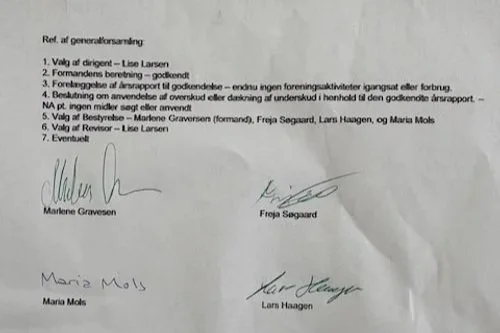 § 8 Tegningsregel. Foreningen tegnes af Formanden eller 2 bestyrelsesmedlemmer hvis formanden er syg eller på ferie.